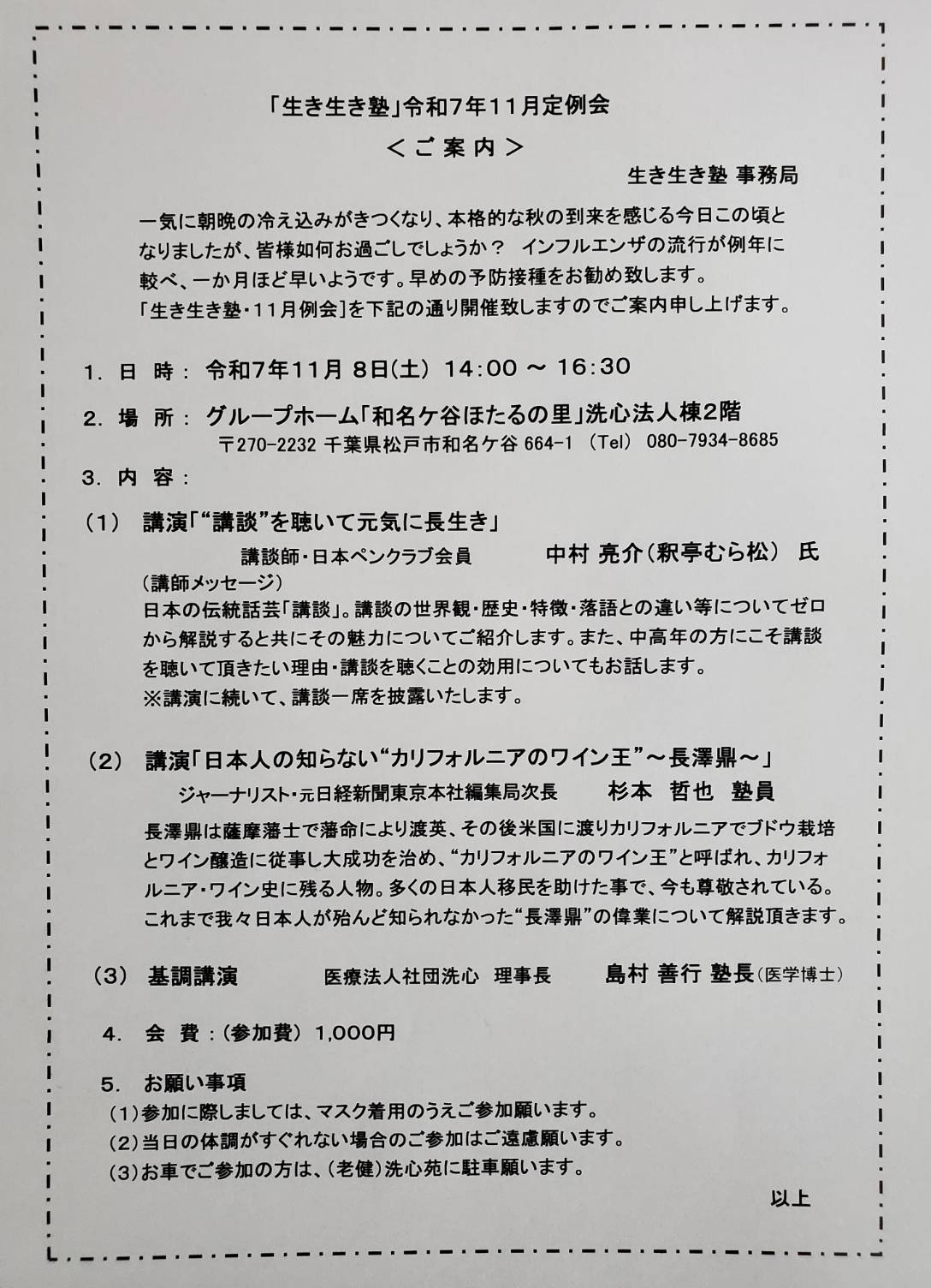 「生き生き塾」令和7年11月定例会の開催のご案内